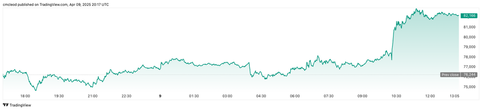 Bitcoin is back to trading near levels seen earlier in the week following an announcement from the White House that tariffs against most countries will be paused for 90 days, after which reciprocal tariffs will be lowered to 10 percent. China is an exception — tariffs against the country have been boosted immediately to 125 percent.