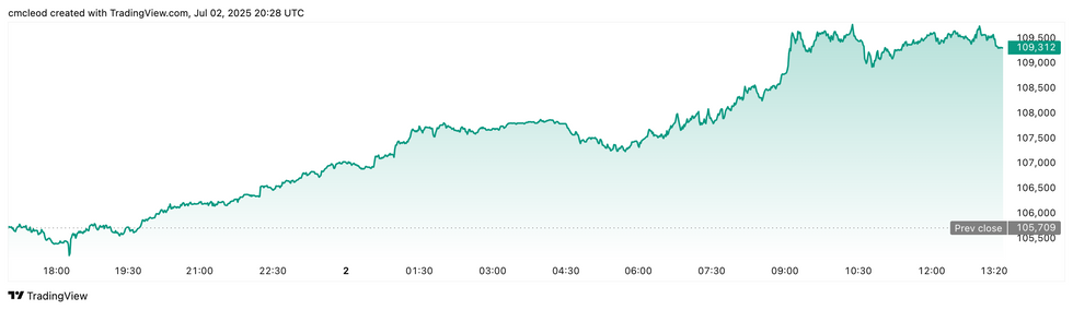 Bitcoin (BTC) is priced at US$109,452, up by four percent in the last 24 hours, and its highest valuation of the day. The day’s range for the cryptocurrency brought a low of US$107,542.