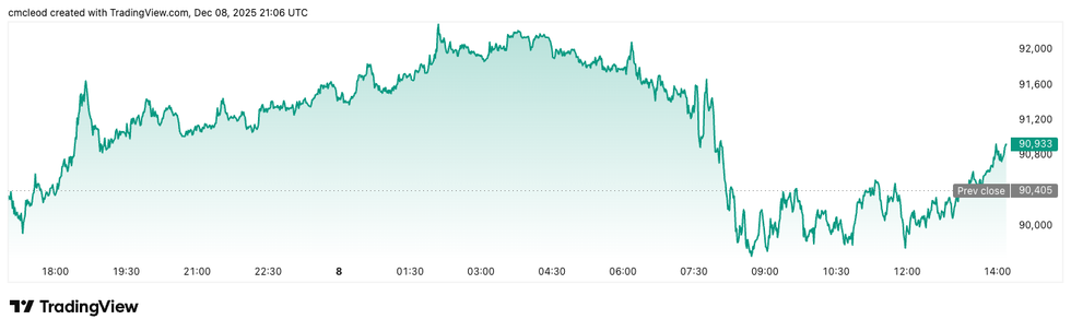 Bitcoin price performance, December 8, 2025.