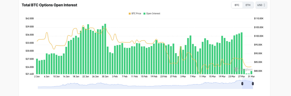 Total Bitcoin options open interest vs. the Bitcoin price, January 2 to March 31, 2025.