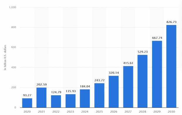 Data from Statista unveils a staggering reality – the global AI market stands at a robust $184 billion. While giants like Nvidia (NVDA) have witnessed a meteoric rise of 2,778% over the past half-decade, it’s crucial to remember that technological revolutions unfold over years, not mere months. Analysts predict that the AI market is poised to catapult from $184 billion to a colossal $826 billion within the next six years.
