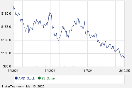 Below is a chart showing the trailing twelve month trading history for Advanced Micro Devices Inc, and highlighting in green where the $95.00 strike is located relative to that history: