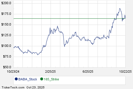 Below is a chart showing the trailing twelve month trading history for Alibaba Group Holding Ltd, and highlighting in green where the $165.00 strike is located relative to that history:
