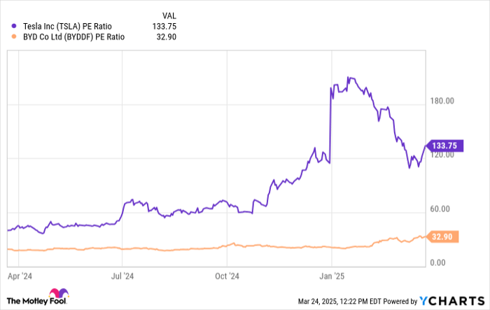 While Tesla’s stock has struggled this year, share prices of BYD have risen nearly 53%. BYD stock also still trades at a much cheaper multiple on a price-to-earnings basis (as of March 24).