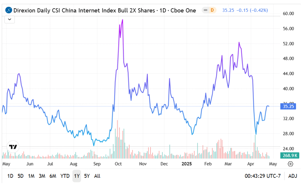 The CWEB ETF: While circumstances have been shaky, particularly in early April during the announcement of the Liberation Day tariffs, the CWEB ETF appears to be making a recovery effort.