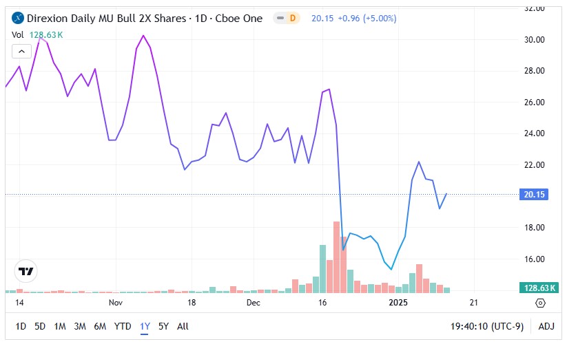 The Direxion ETFs: Investors wanting to jump into the fray but without the complexities of advanced trading strategies may consider two Micron-focused exchange-traded funds. First, the Direxion Daily MU Bull 2X Shares MUU is a leveraged fund that seeks daily investment results of 200% of the performance of MU stock.