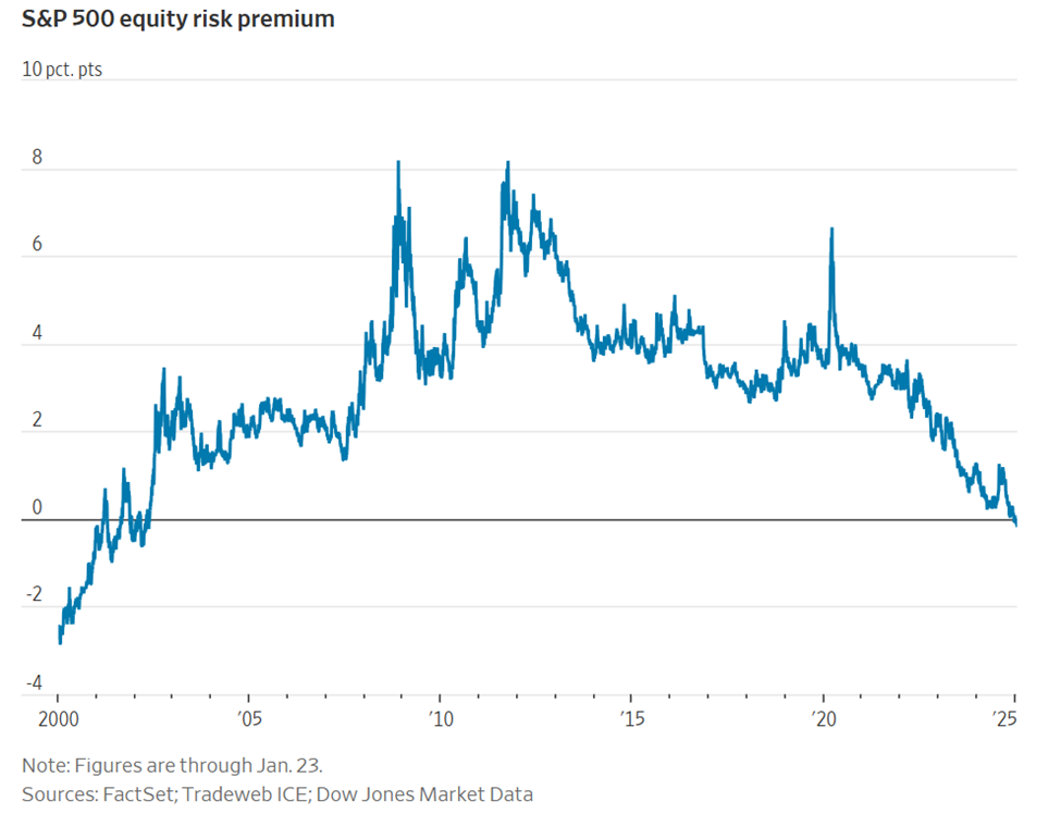 The equity risk premium, often defined as the gap between the S&P 500’s earnings yield and that of 10-year Treasurys, turned negative in late December for the first time since 2002 and sat last week at negative 0.15 percentage point.