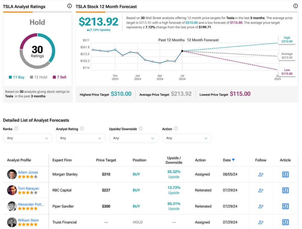 While direct investment in Starlink is not an option due to its private status, investing in Musk’s Tesla ventures remains a viable option. On Wall Street, analysts maintain a Hold consensus rating on Tesla (TSLA) stock, comprising 11 Buys, 12 Holds, and seven Sells over the past three months. Despite a 20.62% dip in share price over the last year, the average price target of $213.92 per share suggests a potential upside of 7.12%.