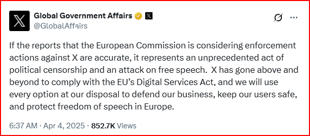 X’s global government affairs account hit back at the European regulators on Friday. “If the reports that the European Commission is considering enforcement actions against X are accurate, it represents an unprecedented act of political censorship and an attack on free speech,” X stated.