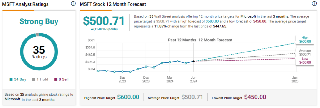 Market analysts continue to express optimism regarding MSFT stock, maintaining a Strong Buy consensus rating based on 34 Buy recommendations and one Hold. Over the past year, MSFT has recorded a significant increase of over 35%, indicating a positive trend in its performance. The average price target for MSFT stands at $500.71, suggesting an upside potential of 11.8% from its current valuation.