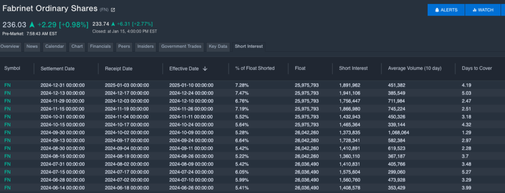 Yet, despite this bullish setup, short interest in Fabrinet has surged 10.2% in December. Fabrinet has 7.28% of shares now sold short.