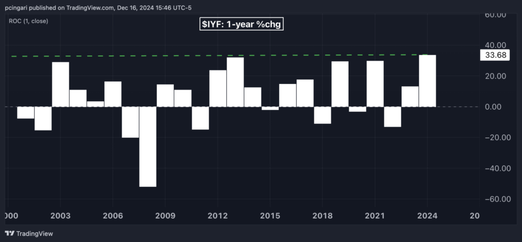 The iShares U.S. Financial ETF IYF has skyrocketed 34% year-to-date, representing the fund’s best annual performance since its launch in 2001.