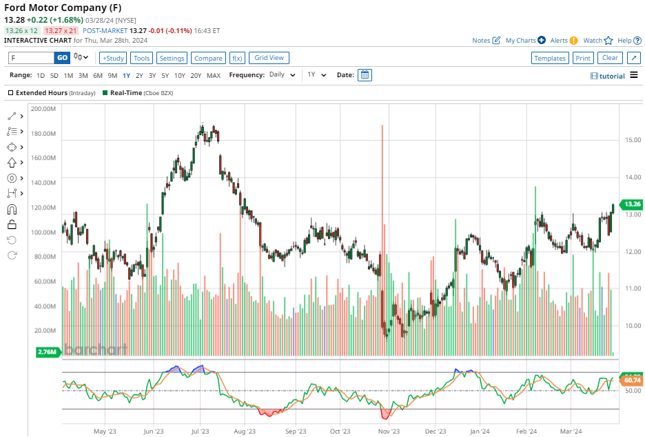 Established in 1903, Michigan-based Ford Motor Company (F) crafts and sells a portfolio of trucks, commercial vehicles, SUVs, and luxury Lincoln automobiles globally. The company boasts a current market cap of $51.89 billion.