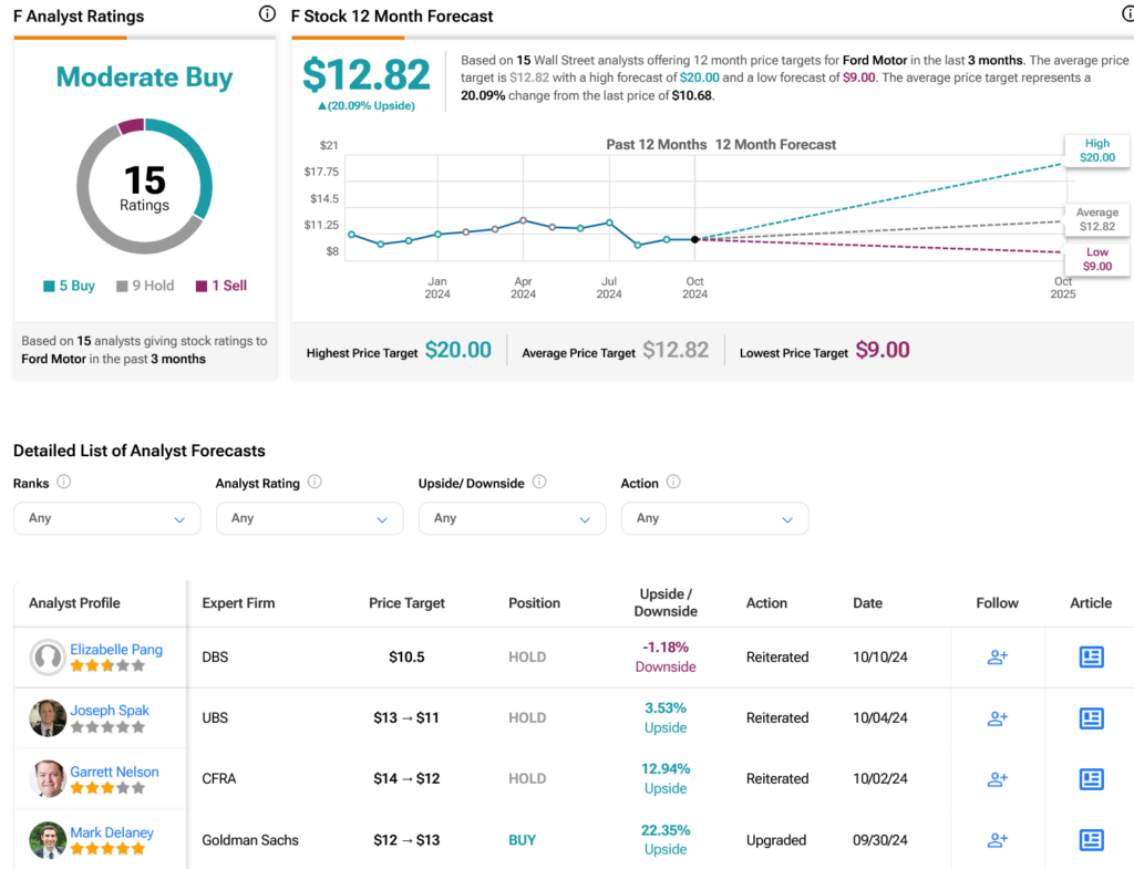 Shifting focus to the stock realm, Wall Street pundits bestow a Moderate Buy consensus rating upon F stock, with a past three-month analysis revealing five Buy ratings juxtaposed against nine Holds and a solitary Sell. Despite enduring a 7.04% downturn in its share price over the past year, the average F price target of $12.82 per share showcases a promising 24.86% upside potential.