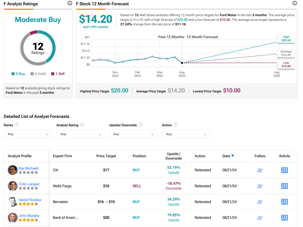 Market analysts maintain a Moderate Buy consensus on Ford stock, with five Buy ratings, six Holds, and one Sell over the past three months. Despite a modest 1.92% share price increase in the last year, the average price target of $14.20 per share forecasts a promising 27.24% upside potential for investors.