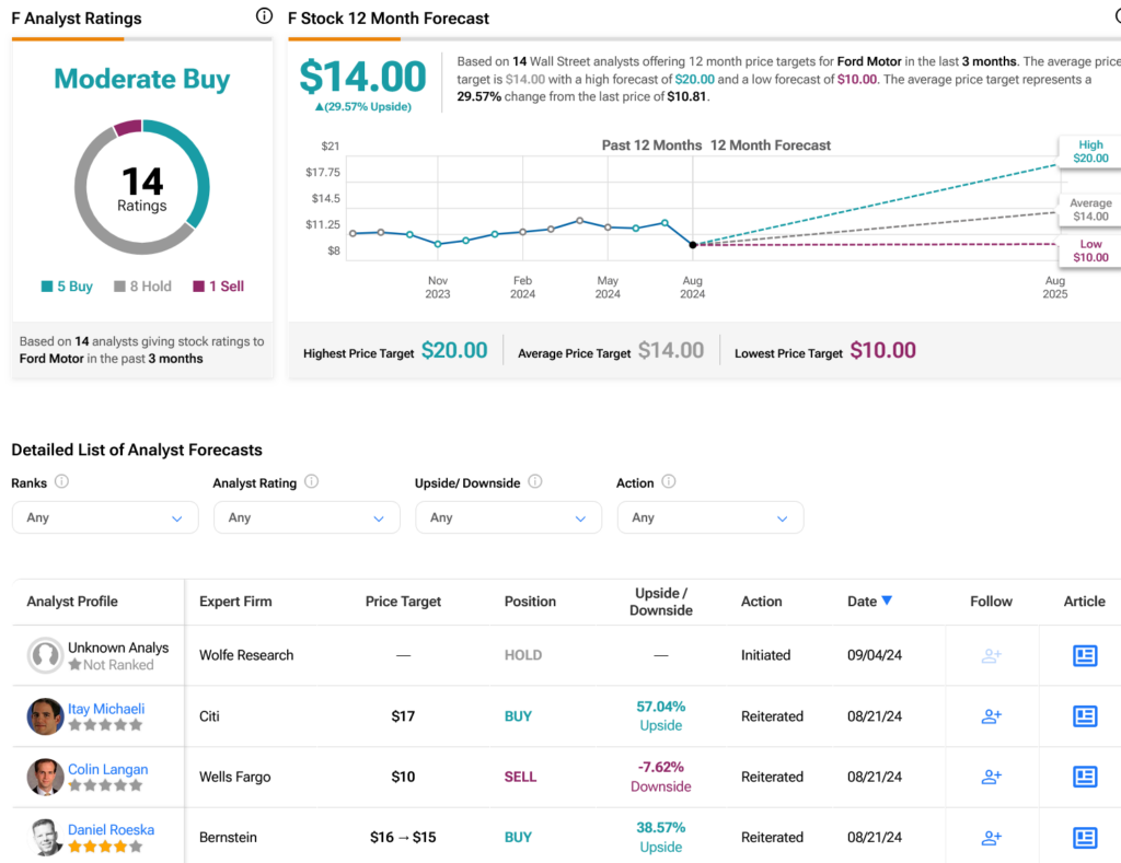 Shifting gears to the financial realm, Wall Street analysts have assigned a Moderate Buy consensus rating to F stock, with a mix of five Buy ratings, eight Holds, and one Sell over the past three months. Despite a 3.86% rally in the stock price over the past year, the current average price target for Ford stands at $14 per share, suggesting a potential upside of 29.57%.