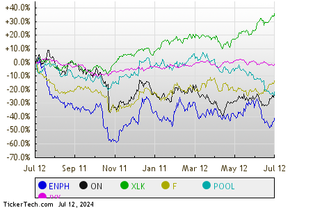 The stock market dance floor on this recent Friday has been illuminated with the energy of the Technology & Communications sector. Like an eager debutant, this sector boasts a 1.9% rise, outshining others. Enphase Energy Inc. (ENPH) and ON Semiconductor Corp (ON) confidently strut their stuff, showcasing gains of 6.1% and 5.4%, respectively, making them the day’s undeniable show-stealers. The Technology Select Sector SPDR ETF (XLK) is the diligent observer at this glamorous tech gala, mirroring the sector’s movements with a 1.8% increase today and a jaw-dropping 22.92% jump year-to-date. However, Enphase Energy Inc. appears to have stumbled slightly on its path, down 10.33% for the year, while ON Semiconductor Corp isn’t far behind, down 6.36%. Together, ENPH and ON add a sprinkle of spice, accounting for approximately 0.5% of XLK’s holdings.