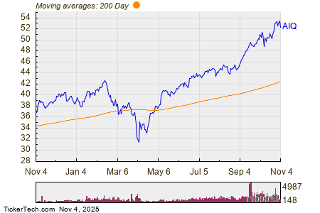 Looking at the chart above, AIQ’s low point in its 52 week range is $30.60 per share, with $53.75 as the 52 week high point — that compares with a last trade of $52.49. Comparing the most recent share price to the 200 day moving average can also be a useful technical analysis technique — learn more about the 200 day moving average ».
