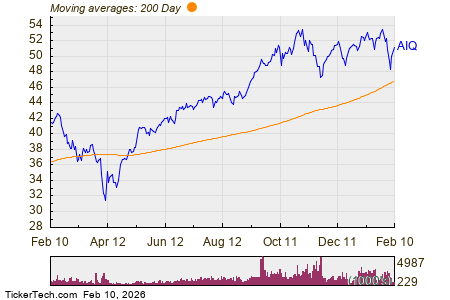 Looking at the chart above, AIQ’s low point in its 52 week range is $30.60 per share, with $53.94 as the 52 week high point — that compares with a last trade of $51.22. Comparing the most recent share price to the 200 day moving average can also be a useful technical analysis technique — learn more about the 200 day moving average ».