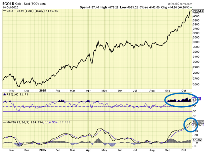 Given how overbought gold is today, we think the pullback will come in stronger than these examples. So, don’t be surprised if gold retreats below $4,000 for a stretch.
