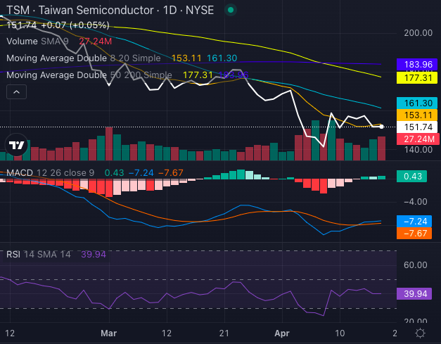 Despite the stellar report, TSM stock is flashing technical warning signs all over the board. At $151.74, it’s trading below its eight, 20, 50 and 200-day simple moving averages (SMAs). In trader speak, that’s a bearish signal coming from every major trend line. The 50-day SMA stands at $177.31, and the 200-day SMA is way up at $183.96 – have recently made a Death Cross.