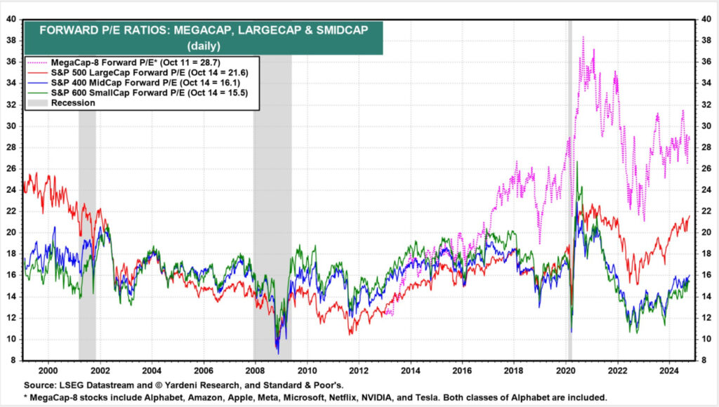 Magnify the lens on the chart below. It showcases the stratospheric valuation levels of “Mega Cap” stocks such as Nvidia, Microsoft, and Apple, well exceeding historical norms.