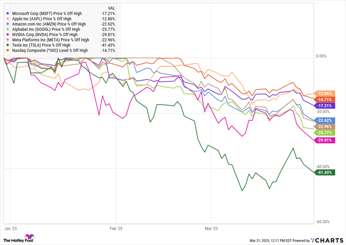 The members of the “Magnificent Seven” — the much-watched group of tech megacaps comprised of Microsoft (NASDAQ: MSFT), Apple (NASDAQ: AAPL), Amazon (NASDAQ: AMZN), Alphabet (NASDAQ: GOOG) (NASDAQ: GOOGL), Nvidia (NASDAQ: NVDA), Meta Platforms (NASDAQ: META), and Tesla (NASDAQ: TSLA) — have almost all fallen even further. Those giants are down by an average of 25% from their 2025 peaks. Only one has fallen less than the Nasdaq — Apple.