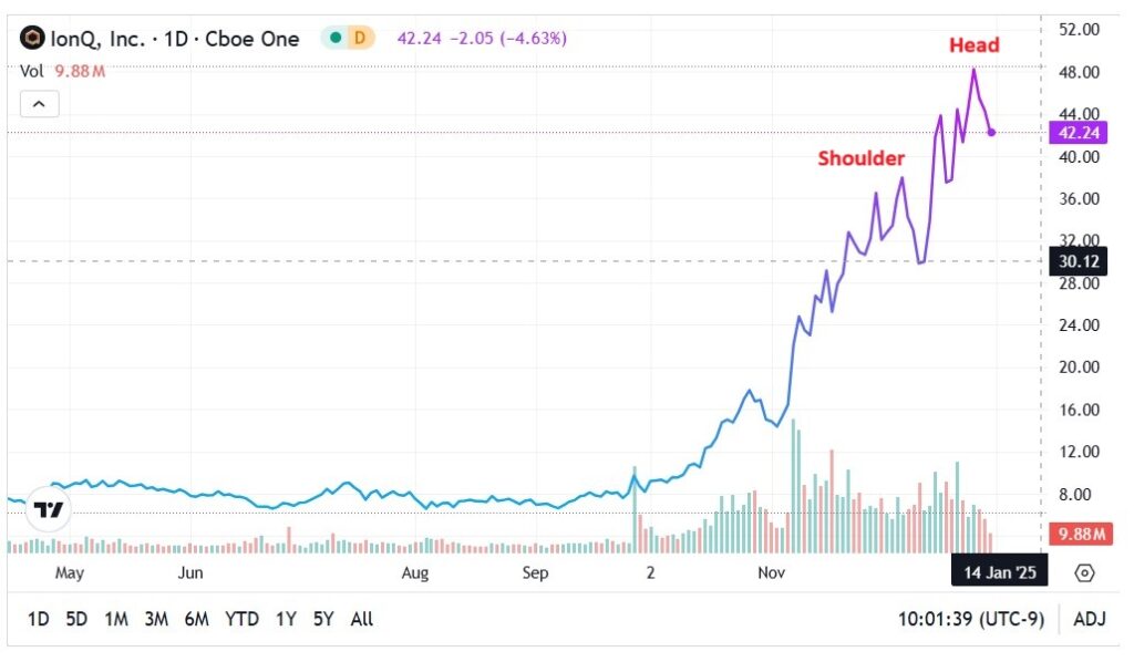 Another reason to be cautious about IonQ stock is its technical pattern. Currently, IonQ appears to be printing a bearish head-and-shoulders formation. If so, the pattern may suggest near-term downside risk.