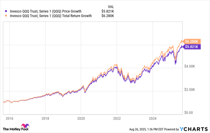 Over the past decade, QQQ has also been one of the best ETFs for investors to hold. Had you put $1,000 in the ETF 10 years ago (using Aug. 25, 2015, as the starting point), it would be worth over $5,800 today. And if you include dividends paid out during that time, the investment would be worth over $6,200.