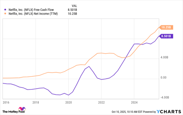 Meanwhile, after struggling with profitability for years due to the company’s heavy investments in content, Netflix is now reporting impressive free cash flow and net income growth.
