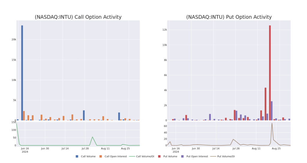Evaluating volume and open interest is critical in options trading. These metrics provide insights into the liquidity and investor interest in Intuit’s options at specific strike prices. The following data illustrates the changes in volume and open interest for calls and puts related to Intuit’s substantial trades within a strike price range of $590.0 to $640.0 over the past 30 days.