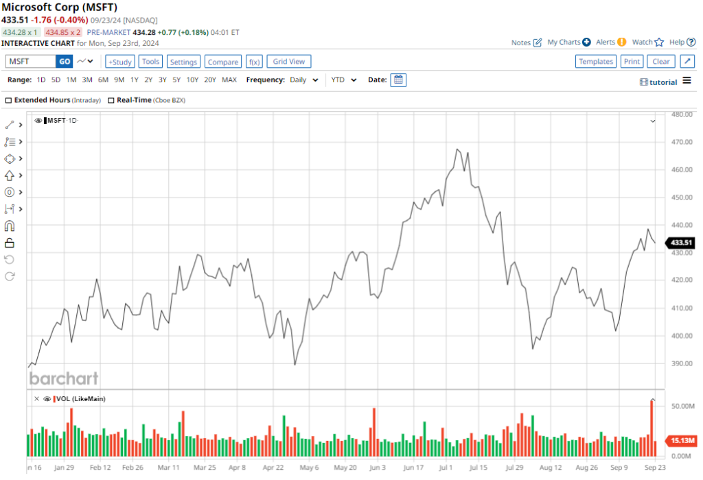 While some tech giants like Nvidia (NVDA) and Tesla (TSLA) have been hogging the limelight in 2024, Microsoft (MSFT) appears to be sailing a steadier course. Despite its groundbreaking ventures into artificial intelligence, including investments in OpenAI’s ChatGPT, Microsoft’s share performance seems modest, with a YTD increase of 14.1%, in comparison to the S&P 500 Index and Nasdaq Composite’s returns.