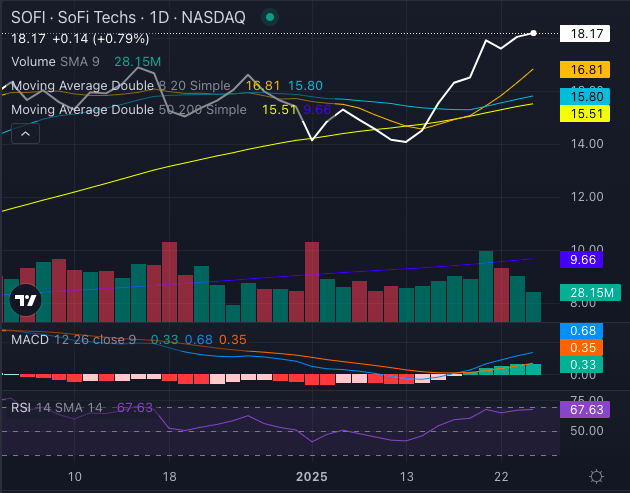 SoFi stock, at $18.17, surpassing its eight-day simple moving average of $16.81, 20-day simple moving average of $15.80 and 50-day simple moving average of $15.51, reinforcing a bullish outlook.