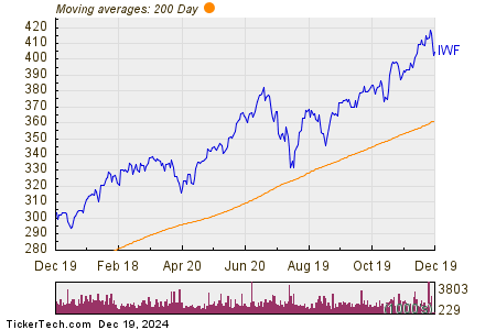 Looking at the chart above, IWF’s low point in its 52 week range is $293.79 per share, with $419.5263 as the 52 week high point — that compares with a last trade of $405.14. Comparing the most recent share price to the 200 day moving average can also be a useful technical analysis technique — learn more about the 200 day moving average ».