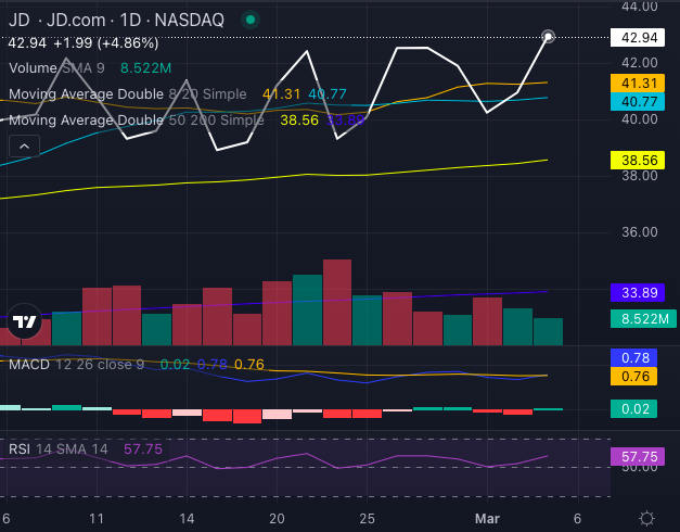 JD.com stock is currently in a strong bullish trend, trading above its five-day, 20-day and 50-day exponential moving averages. The stock’s price of $42.94 remains above key support levels, with the eight-day simple moving average at $41.31, 20-day at $40.77 and the 50-day at $38.56 — all reinforcing the bullish momentum.
