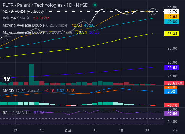 Palantir’s stock has been soaring this year, witnessing an impressive 158% surge year-to-date. The stock remains comfortably above its key moving averages, with the current price of $42.70 signaling bullish sentiment supported by indicators like the eight-day SMA ($42.63) and the 20-day SMA ($40.80).