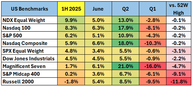 This year has been nothing short of a wild ride for U.S. equities, starting with the S&P 500 declining more than 21% from its February high into the low reached during the second week of April. Tariff uncertainty drove the early stages of the selloff, while the administration’s “Liberation Day” announcement caused the most extreme volatility and downside momentum. Due in part to stresses in the plumbing of the financial system, the administration quickly reversed course by postponing “reciprocal tariffs” for 90-days. Over the remining 12 weeks in Q2, a broad V-shaped rally culminated in new all-time highs for the S&P 500 and Nasdaq 100 supported with a leadership profile (Technology, Industrials, Financials) signaling a healthy economy.