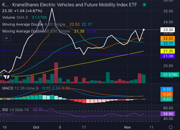 The ETF, which tracks the global transition to electric vehicles (EVs) and future mobility, is experiencing a surge, with its price moving above its five, 20 and 50-day exponential moving averages, signaling strong bullish momentum.