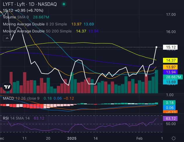 Lyft stock at $15.12, is comfortably above its eight-day simple moving average (SMA) of $13.97, its 20-day SMA of $13.69, and even its 50-day SMA of $14.37, reinforcing its upward momentum.