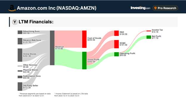 Amazon provided Q1 2026 guidance of $173.5B–$178.5B in revenue and $16.5B–$21.5B in operating income. Analysts’ expectations center near $177–178B (about +14% YoY) with EPS around $1.61–$1.63. AWS (projected mid‑20% growth) and Advertising (roughly $16–17B quarterly run‑rate) remain the primary margin drivers this quarter — together they underwrite the company’s broader investments.
