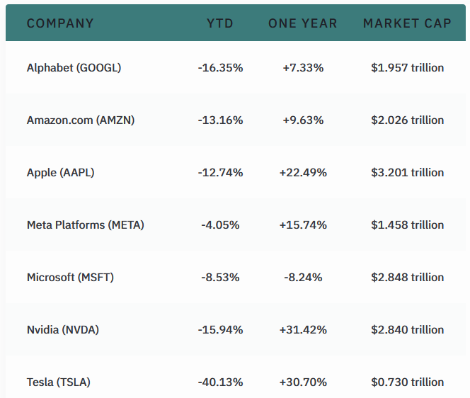 Year-to-date, Alphabet and Tesla suffered largest dips.