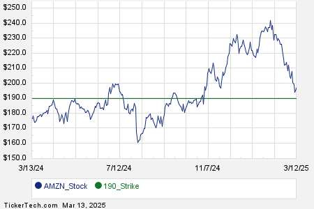 Below is a chart showing the trailing twelve month trading history for Amazon.com Inc, and highlighting in green where the $190.00 strike is located relative to that history: