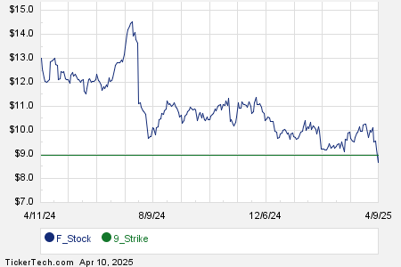 Below is a chart showing the trailing twelve month trading history for Ford Motor Co., and highlighting in green where the $9.00 strike is located relative to that history: