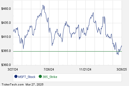Below is a chart showing the trailing twelve month trading history for Microsoft Corporation, and highlighting in green where the $385.00 strike is located relative to that history: