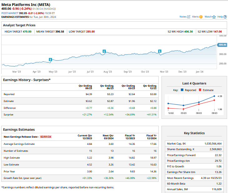 Analysts are estimating Meta to post revenues of $39.17 billion for Q4, reflecting a 21.8% increase from the same quarter last year. Notably, in their Q3 earnings call, Meta projected Q4 revenues between $36.5 billion and $40 billion, with a wider-than-usual range in light of the escalating volatility due to the Israel-Hamas war in Q4.