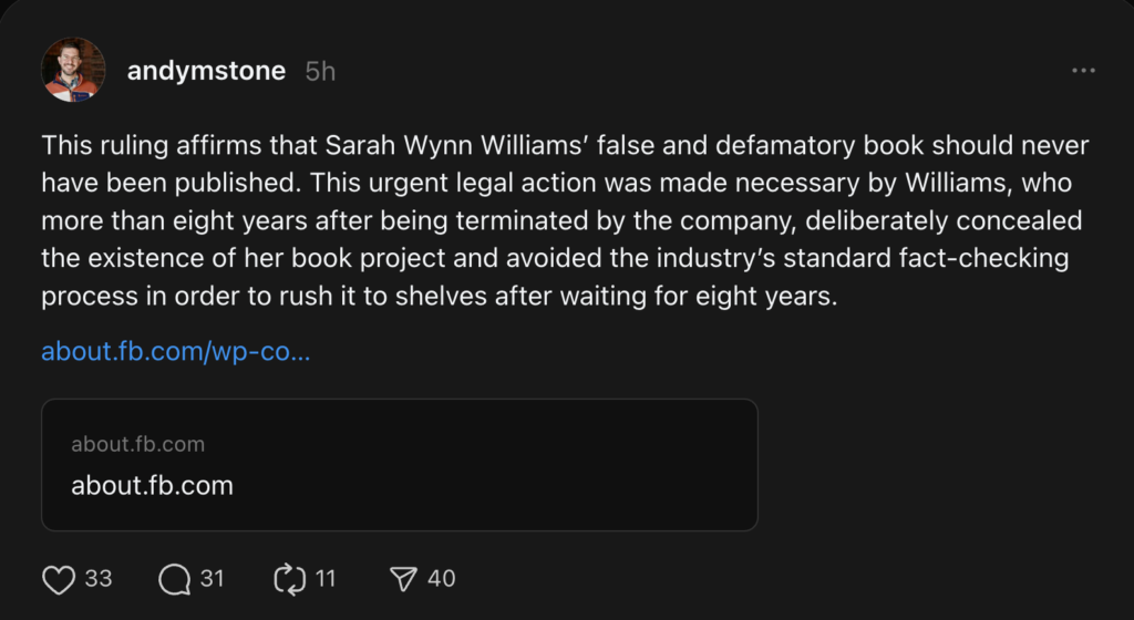Meta spokesperson Andy Stone took to Threads and called the book “false and defamatory,” adding that Wynn-Williams “deliberately concealed” the project and avoided industry-standard fact-checking.