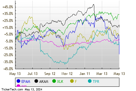 As the trading day unwound on Monday, the Technology & Communications sector held its ground as the top-performing sector, boasting a 0.3% increase. Epam Systems, Inc. (EPAM) and Akamai Technologies Inc (AKAM) emerged as the stars of the day, showcasing gains of 3.9% and 3.0%, respectively. Meanwhile, within the realm of technology ETFs, the Technology Select Sector SPDR ETF (XLK) displayed a 0.6% uptick for the day, translating to a solid 7.55% year-to-date growth. However, Epam Systems, Inc. experienced a notable 35.93% decrease year-to-date, while Akamai Technologies Inc faced a 20.63% dip in the same period. Together, EPAM and AKAM constitute approximately 0.3% of the underlying holdings of XLK.