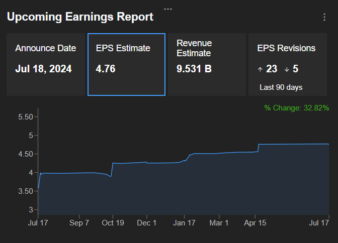 In terms of key data, analysts are forecasting an average EPS of $4.76, almost 10% down on the first quarter, but up 44.6% year-on-year.