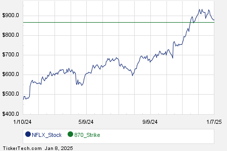 Below is a chart showing the trailing twelve month trading history for Netflix Inc, and highlighting in green where the $870.00 strike is located relative to that history: