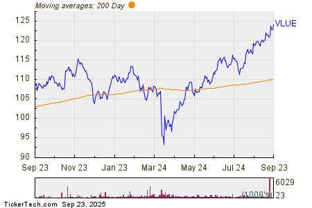 The chart below shows the one year price performance of VLUE, versus its 200 day moving average: